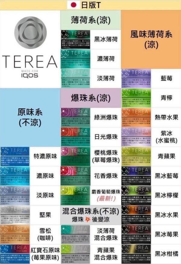 • 28種多元風味:TEREA全系列涵蓋菸草、冰感、爆珠、果香與草本五大類28種風味,滿足不同使用者的口味偏好。